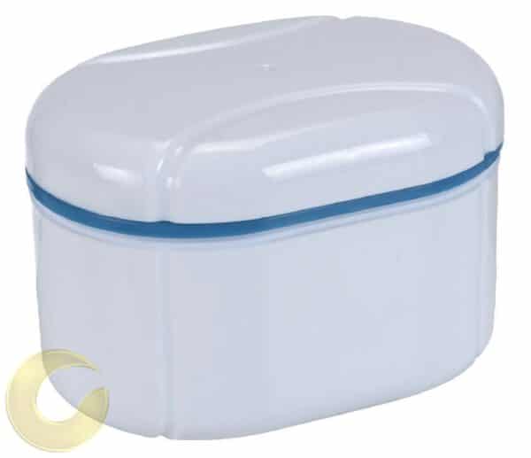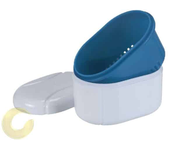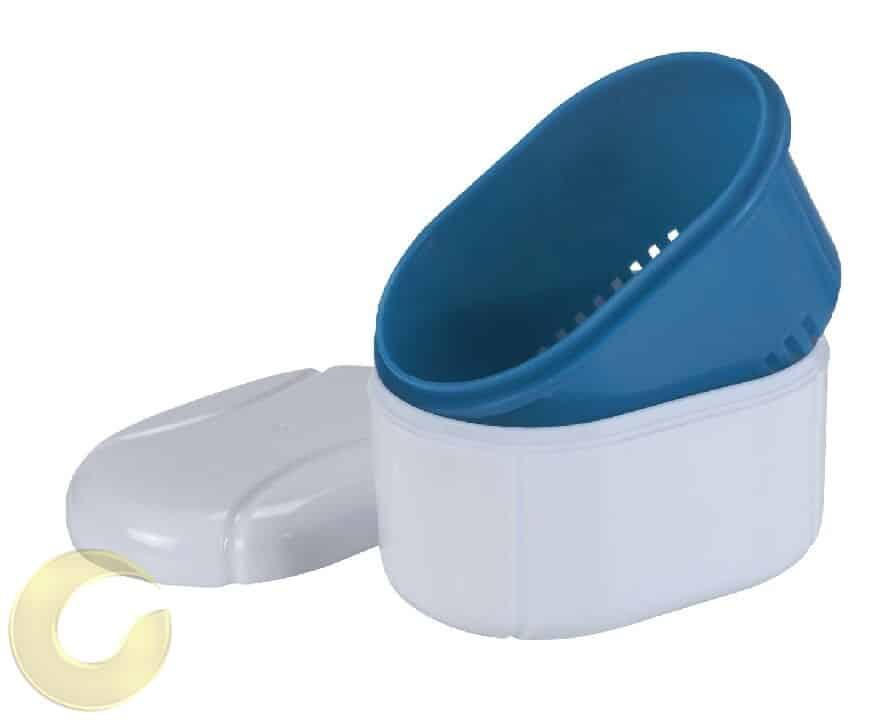 מיכל ייעודי עם רשת פנימית לניקוי והשריית שיניים תותבות Kukident