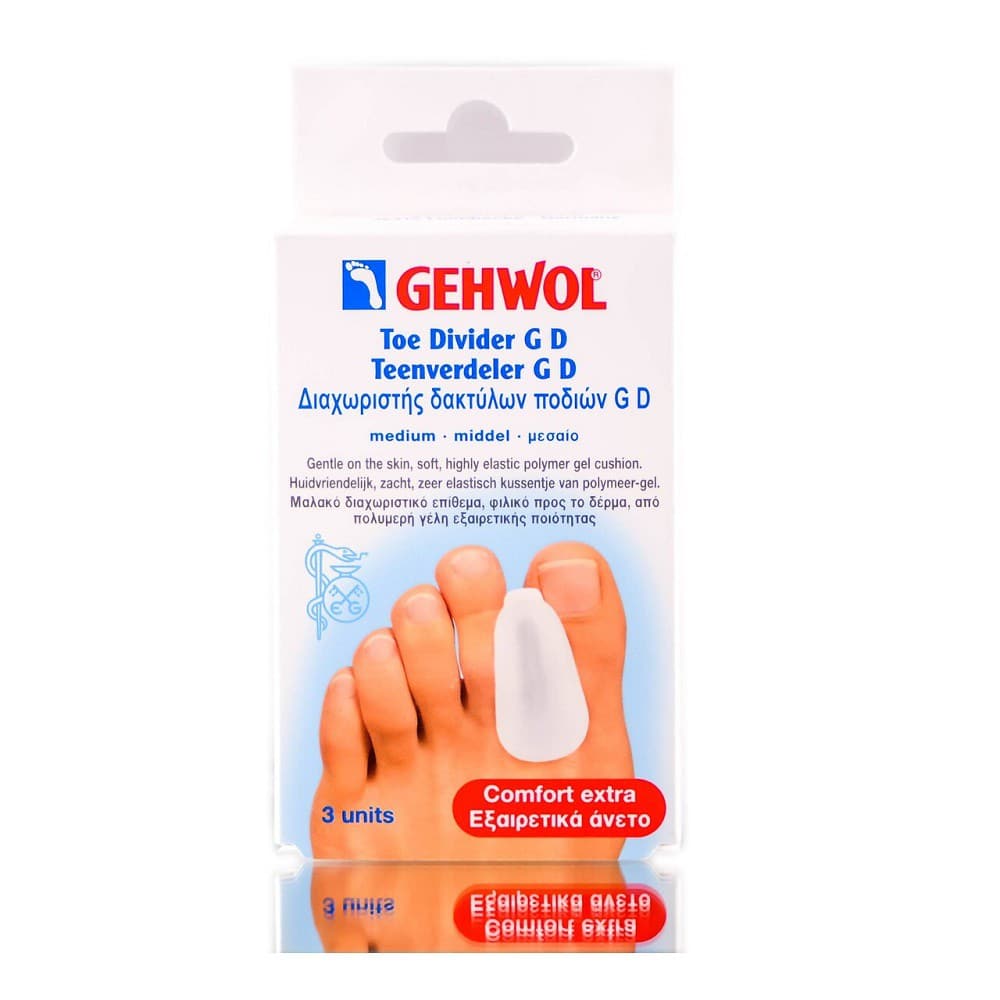 מפריד בהונות רגליים מסיליקון של חברת GEHWOL הגרמנית, למניעת כאבים ושפשופים במצבים של בוהן קלובה (הלוקס ולגוס) או בהונות עקומות או נוטות.