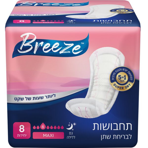 תחבושות Breeze ליותר שעות של שקט - מיועדות לנשים החוות בריחת שתן בינונית, התחבושות מעניקות הגנה מירבית וטובה יותר מתחבושת היגיינית. התחבושות גמישות ובמבנה אנטומי להתאמה לגופך, בעלות פסי הדבקה חזקים למניעת תזוזה, מקופלות וארוזות באריזה אישית לשמירה על דיסקרטיות והיגיינה, בעלות מגע רך ובד נושם לתחושה אוורירית. מאפשרות אורח חיים חופשי ומלא בביטחון.