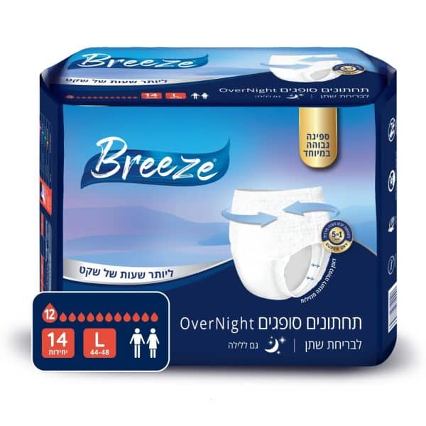 התחתונים של Breeze אלסטיים להתאמה למבנה הגוף, בעלי מגע רך ובד נושם לתחושה אוורירית, דיסקרטיים ושקטים במיוחד. מאפשרים אורח חיים חופשי ומלא בביטחון. התחתונים מיוצרים בטכנולוגיה מתקדמת SUPER DRY 5 IN 1 - מנגנון לכידת נוזלים לתחושת יובש והגנה מרבית מנזילות וריחות. הטכנולוגיה כוללת: ספיגה גבוהה במיוחד, ספיגה מהירה לתחושת יובש, דפנות רכות וגמישות ללכידת נוזלים, מגע רך ובד נושם לתחושה אוורירית ומנטרל ריחות. אינם מכילים לטקס. להסרה יש לקרוע את צידי התחתון, לאחר הסרת התחתון ניתן לגלגל ולסגור באמצעות מדבקה ולהשליך לפח.